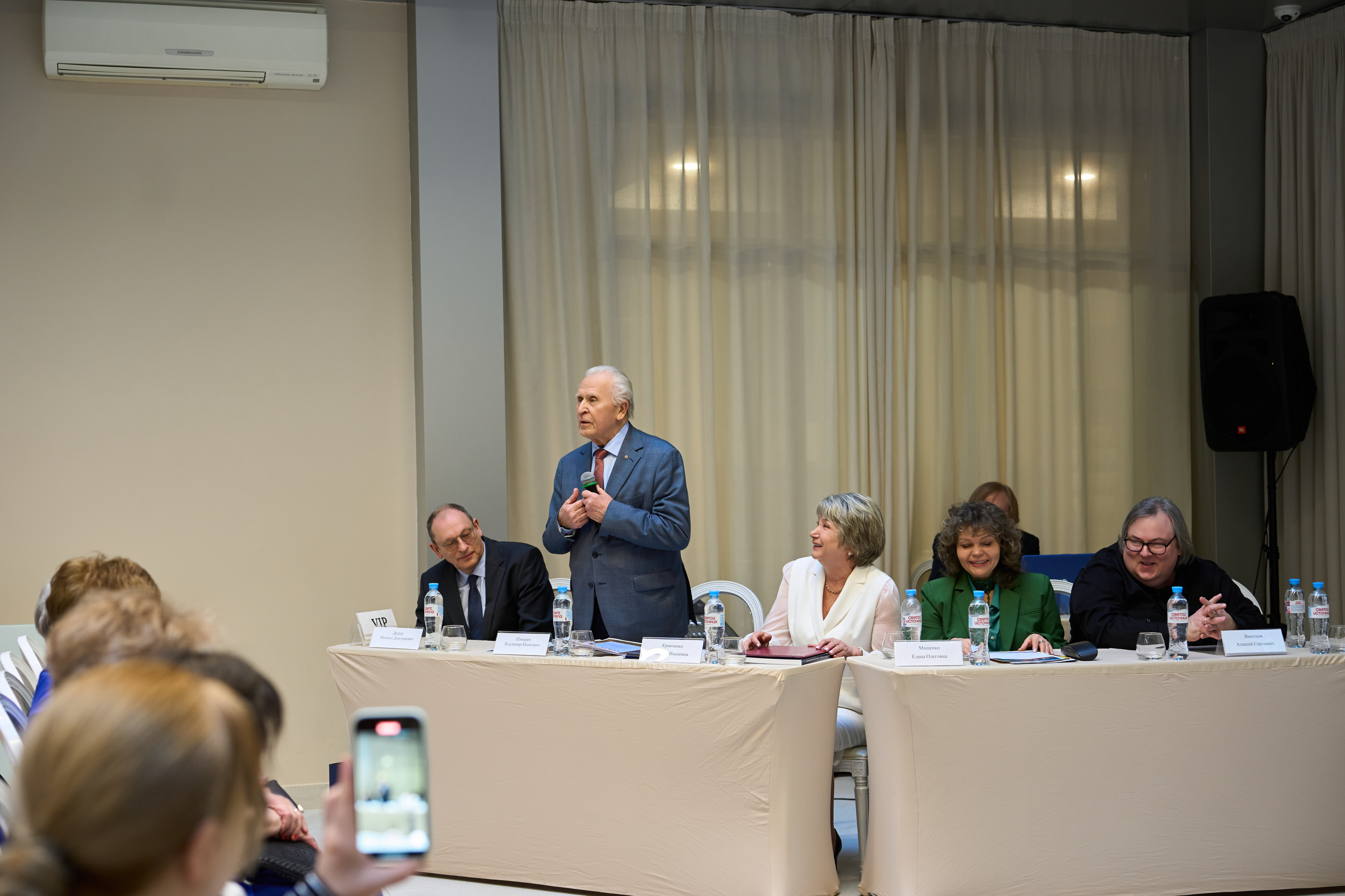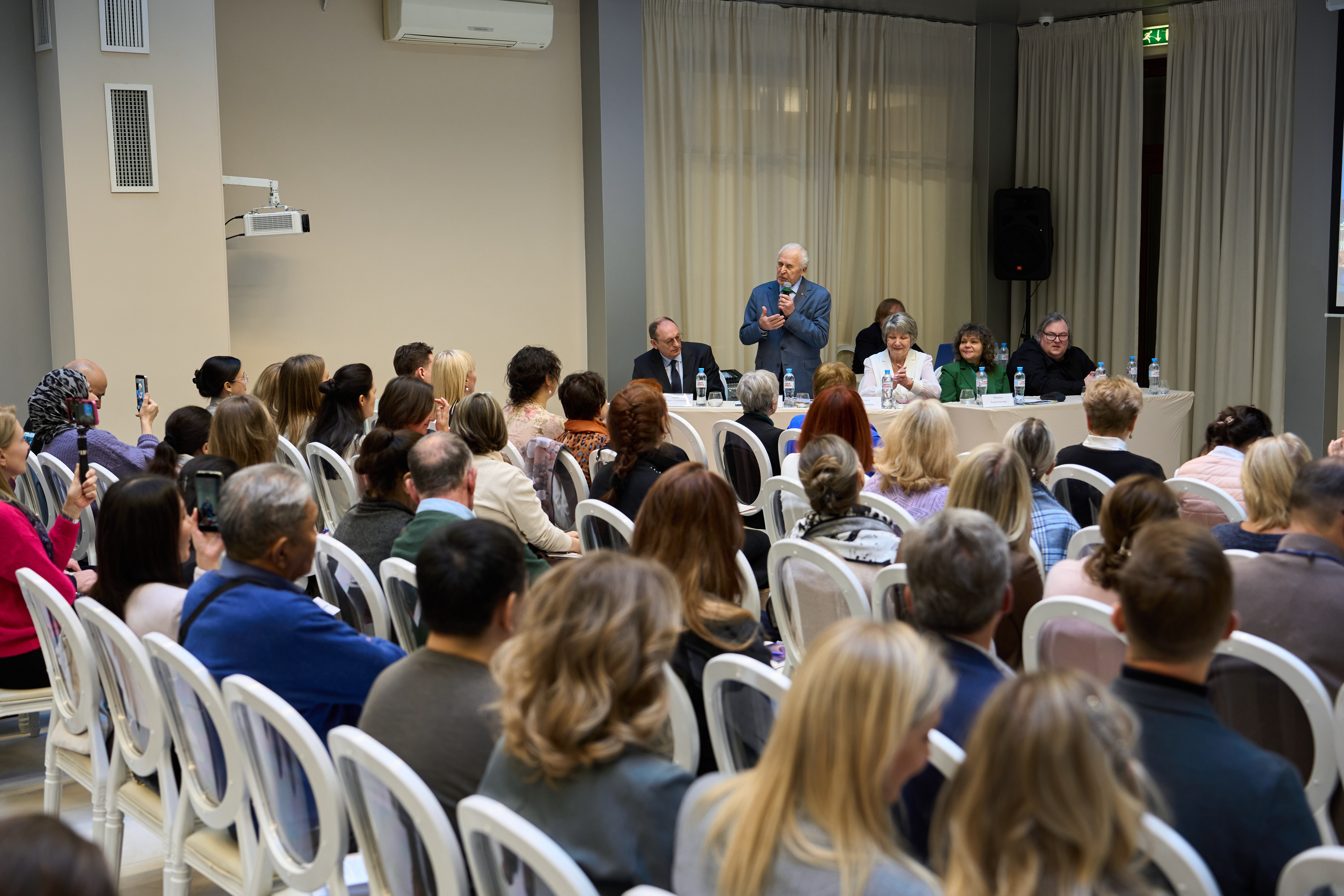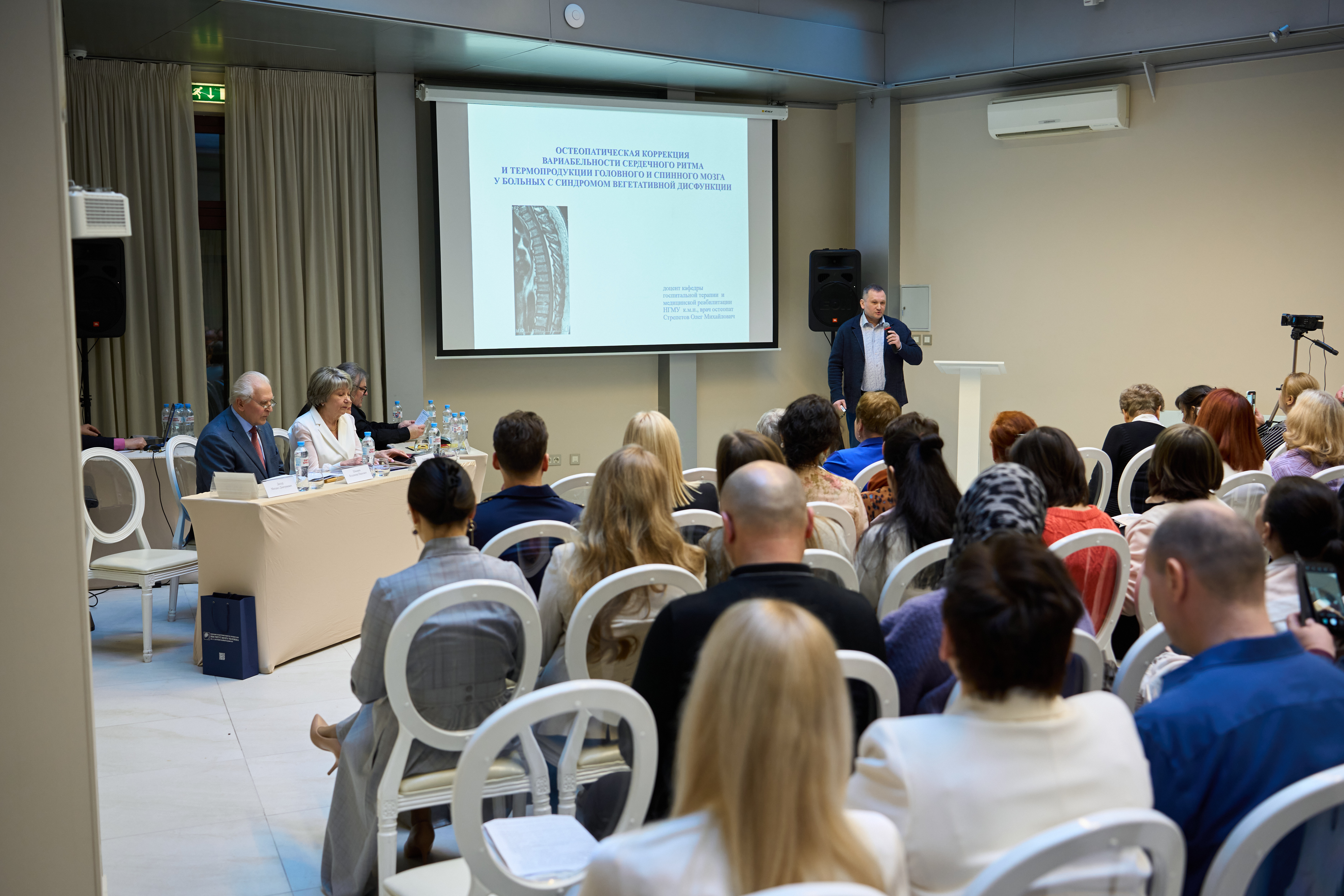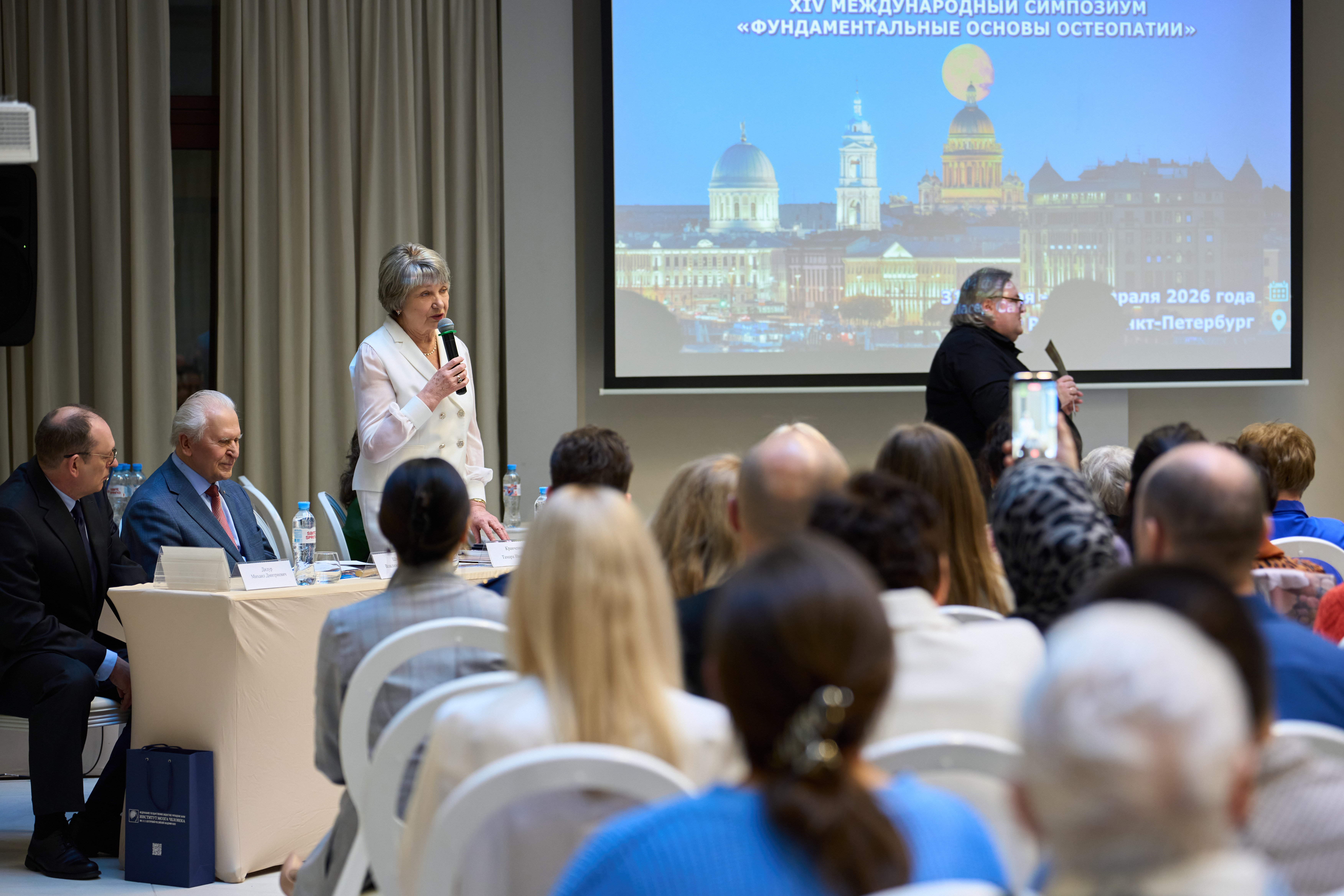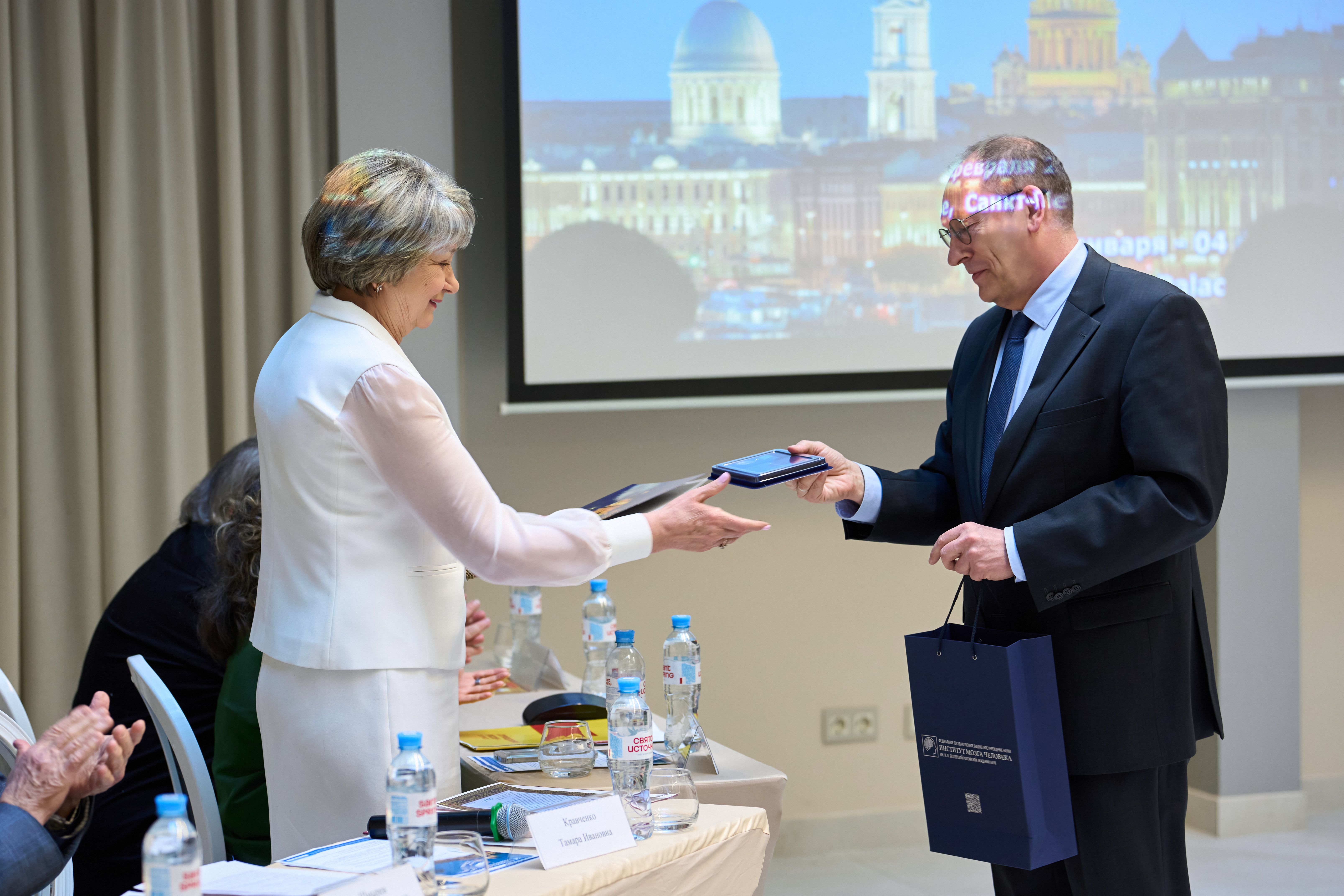 Директор Института мозга человека имени Н.П. Бехтеревой РАН Михаил Дмитриевич Дидур поздравил лично участников симпозиума и преподнес подарок в честь 32 годовщины Русской высшей школы остеопатической медицины ректору Тамаре Ивановне Кравченко.