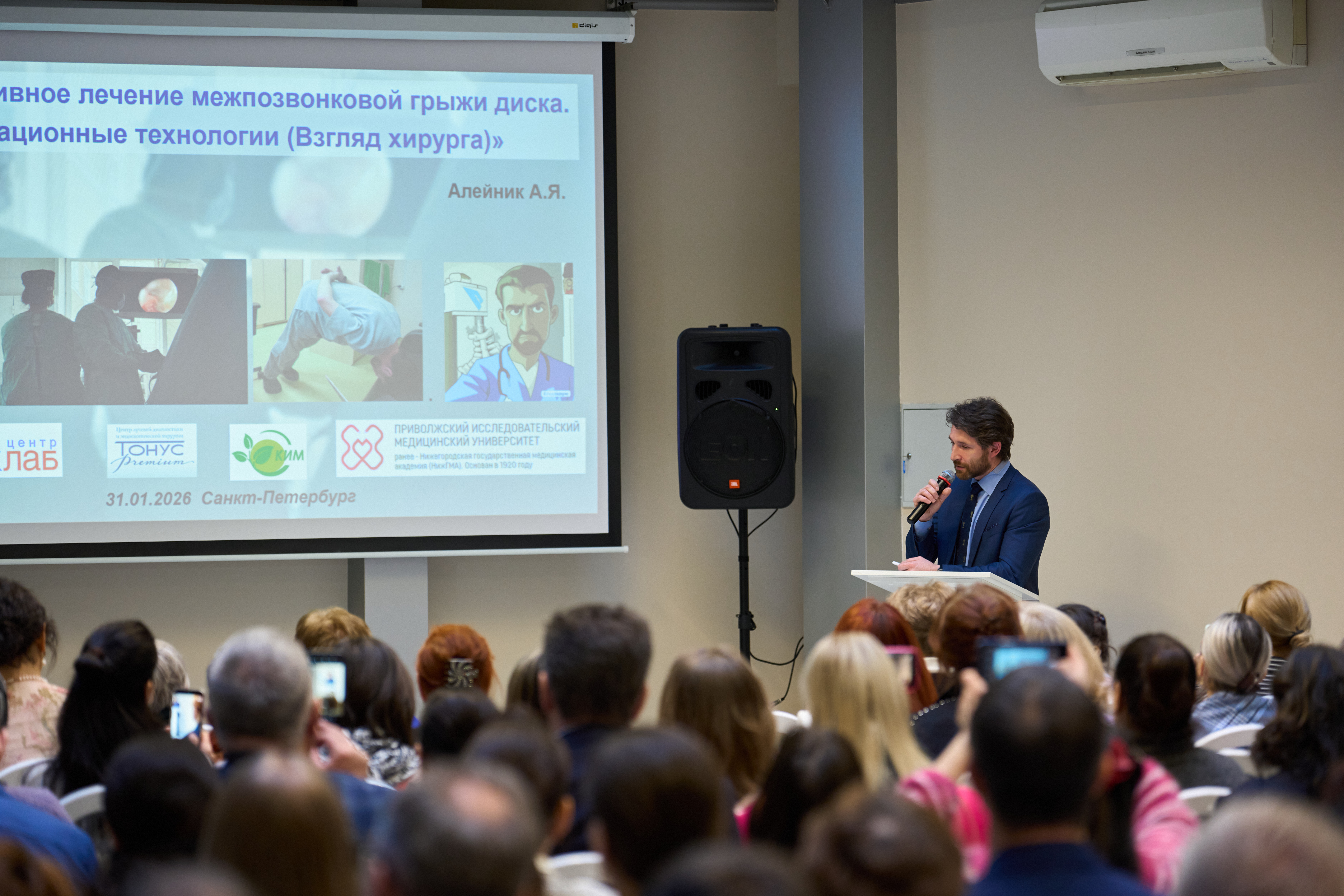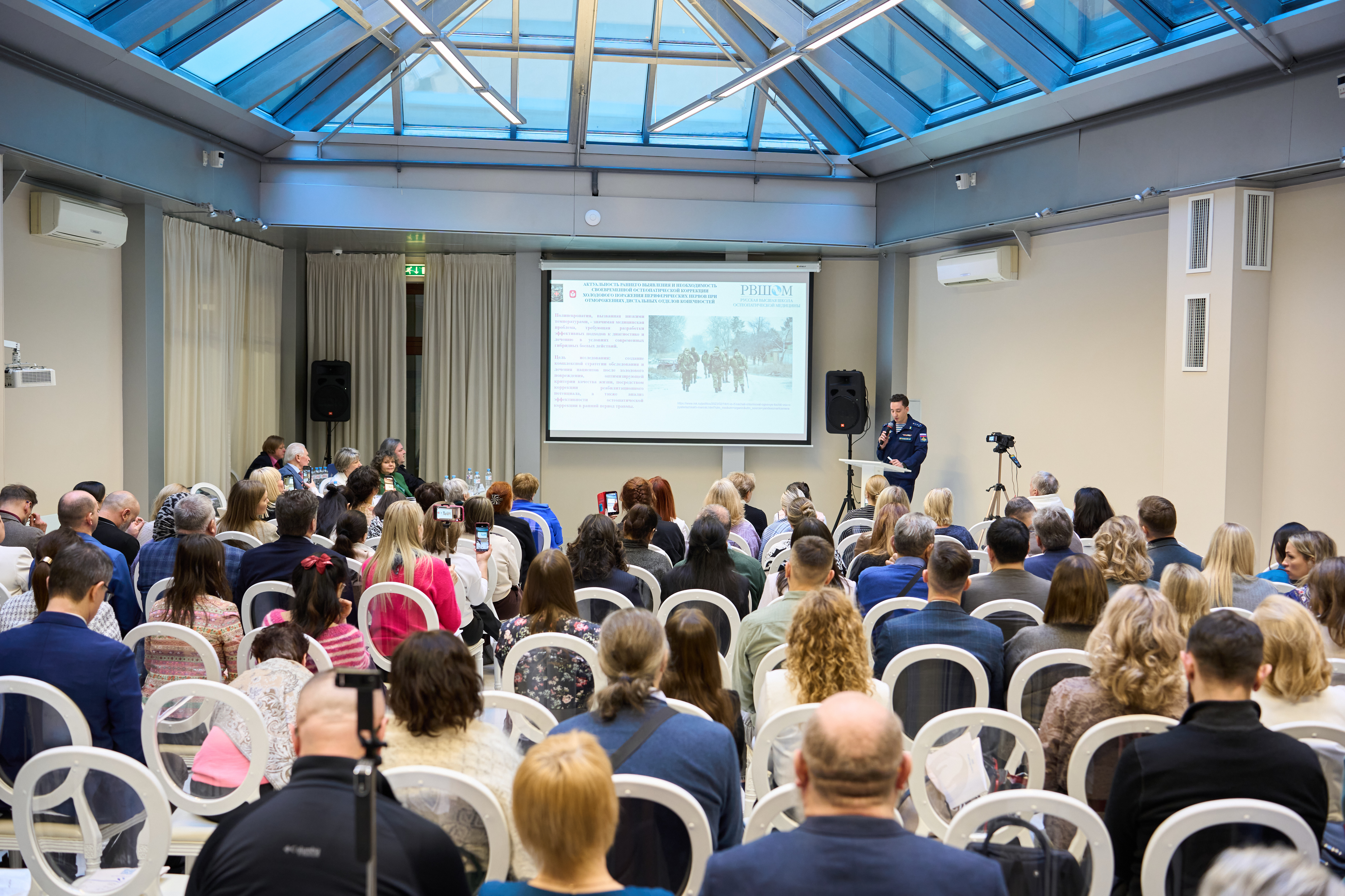С докладом о научных исследованиях, которые проводятся на регулярной основе с 2024 года по настоящее время в рамках волонтерского движения Медицинской ассоциации профессиональных остеопатов на базе военного госпиталя города Курска выступил Антон Владимирович Шеляховский. Исследования проводятся совместно с преподавателями РВШОМ. В докладе были представлены результаты значимой эффективности остеопатического лечения и реабилитации на ранних этапах боевой травмы.